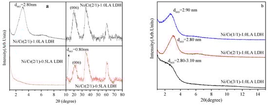 The XRD patterns of Ni/Cr−LA LDHs are shown in Figure 1a,b. The XRD pattern for organic LDHs suggests a d003 of 2.80 nm for Ni/Cr(2/1)−1.0LA LDH, which is much higher than that of inorganic LDH (0.77 nm), as shown in Figure S1. These results indicate that the interlayer spacing of Ni/Cr LDH was increased due to the intercalation of laurate, which is similar to previous studies [28,29]. Ni/Cr(2/1)−1.0LA LDH showed an obvious signal at the characteristic peaks ((003) and (006)) of layered double hydroxide phases in the X−ray diffraction patterns [28,29], while the diffraction peak became weaker with the decreased dosage, as shown in Figure 1a. These results demonstrate that the crystal structures of Ni/Cr LA LDHs were more ordered when the laurate content increased. Figure 1b shows that the characteristic peak (d003) of Ni/Cr(2/1)−1.0LA LDH was the sharpest, and the half-peak width was also small, indicating that Ni/Cr(2/1)−1.0LA LDH has a good crystal shape. When Ni/Cr = 3, the half-peak width of LDH increases significantly, indicating the high Ni content was not conducive to the formation of organic LDH crystal.