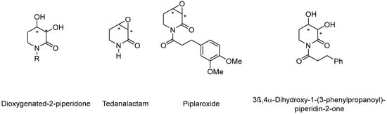 For example, 3,4-dioxygenated-2-pyperidone derived alkaloids from piper species, such as tedanalactam [], piplaroxide [], and 3β,4α-dihydroxy-1-(3-phenylpropanoyl)-piperidin-2-one [], are piperidone alkaloids with enormous pharmaceutical potential (Figure 1).