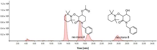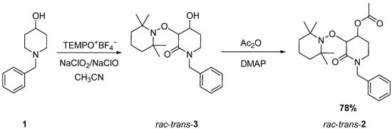 As a widely applied method in our research group [,,], a tandem dual C−H oxidation was carried out using N-benzyl-4-hydroxy-piperidine 1 as starting material. The piperidine derivative was mixed with the TEMPO oxoammonium cation in the presence of sodium chlorite and sodium hypochlorite in acetonitrile to obtain the alkoxyamine lactam (rac-trans-3), which, after acylation, produces rac-trans-2 in good yield (Scheme 1).