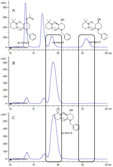 Percolated crude reactions, where rac-trans-3 de-acylated product predominates, were analyzed using the Chiral-Column HPLC technique. Although with low conversion, an excellent enantiomeric excess (99% ee, [α]D20 = +45.2, c 1.0, CHCl3) was obtained, which means that the enzymatic resolution of rac-trans-2 proceeds enantiospecifically (Figure 3), and, moreover, it is a worthwhile method because of the high value (380) obtained for the enantiomeric ratio (E).