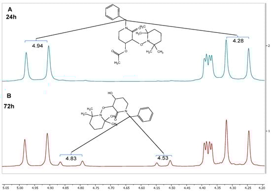 1H-NMR spectra of the reaction crude after (A) 24 h and (B) 72 h.