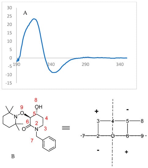 (A) Experimental CD spectrum of (3R,4S)-(−)-3. (B) Structured transformed with octant rule; a positive cotton effect is expected.