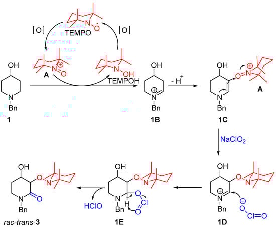 According to the proposed mechanism shown in Scheme 2, cation A promotes the formation of the iminium ion intermediate 1B, which, after the loss of a proton, leads to an enamine intermediate 1C. The addition of TEMPO comes after a nucleophilic attack from the enamine. Finally, a nucleophilic attack by the chlorite ion to the iminium ion intermediate 1D gives 1E, which, after HClO elimination, produces rac-trans-3.