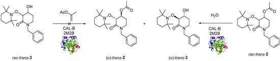 CAL-B catalyzed enzymatic resolution: rac-trans-3 acylation (left) and rac-trans-2 de-acylation (right).