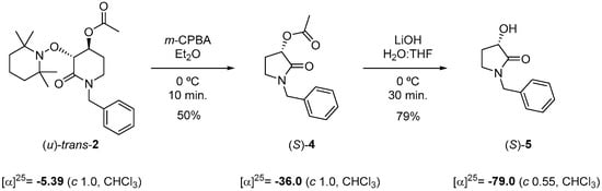 To assign the absolute configuration, a chemical correlation was performed. Taking advantages that optically pure compound (S)-5 was prepared following Huang et al. [] from (S)-malic acid, we transformed (u)-trans-2 to (S)-5 by applying deconstructive lactamization protocol [] with m-CPBA followed by de-acylation in basic conditions of lactam (S)-4 (Scheme 4). The specific rotation for (S)-5 matched to reported [α]D20 = −76.2 (c 1.03, CHCl3).
