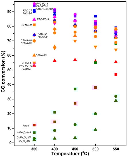 Conventional commercial HTS catalysts are composed of ca. 80–90% of Fe2O3, 8–10% of Cr2O3, and the balance being promoter and stabilizer such as CuO, Al2O3, alkali, MgO, ZnO, etc. [69,70]. Fe3O4(magnetite), which is formed by the partial reduction of α-Fe2O3(hematite), is an active phase for the WGS reaction in the high-temperature range [33,71]. Cr2O3 mainly functions as a textual promoter to prevent the sintering of active Fe3O4 phase and loss of surface area during start-up and operation [33,71]. Fe2O3-Cr2O3 catalysts have been commercially used for more than 70 years despite low performance at a low temperature because they showed the excellent catalytic performance at a high temperature [72].