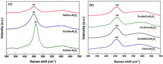 Raman spectra of the Cu-based catalysts: (a) Cu/γ–Al2O3 catalyst and CeO2–promoted Cu/γ–Al2O3 catalysts. Adapted from Ref. [27]. Copyright 2016 Elsevier. (b) Ce/Cu/Al2O3 catalysts with various additives. Adapted from Ref. [48]. Copyright 2020 Elsevier.