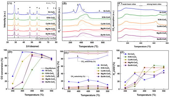 (A) XRD patterns of Ni-based catalysts; (B) H2-TPR of Ni-based catalysts; (C) CO2-TPD patterns of Ni-based catalysts; (D) CO conversion of Ni-based catalysts. (E) Selectivity to CH4 and CO2 of Ni-based catalysts; (F) H2 yield of Ni-based catalysts. Adapted from Ref. [87]. Copyright 2022 Elsevier.