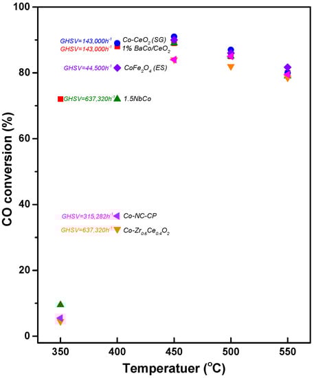 As discussed in the previous section (Ni), Co is also one of the non-precious candidates for the WGS reaction. A number of active sites and oxygen storage capacity are the key properties of the Co/CeO2 catalyst. Research has tried to improve the characteristics of Co/CeO2 by adding the promoter, optimizing the composition, and using various synthesis methods. In this section, four papers related to Co-based catalysts are summarized, and descriptions are distinguished by naming [BCC], [CZC], [CC-M], [C-NC], and [CF] in front of descriptions for each characteristic analysis.