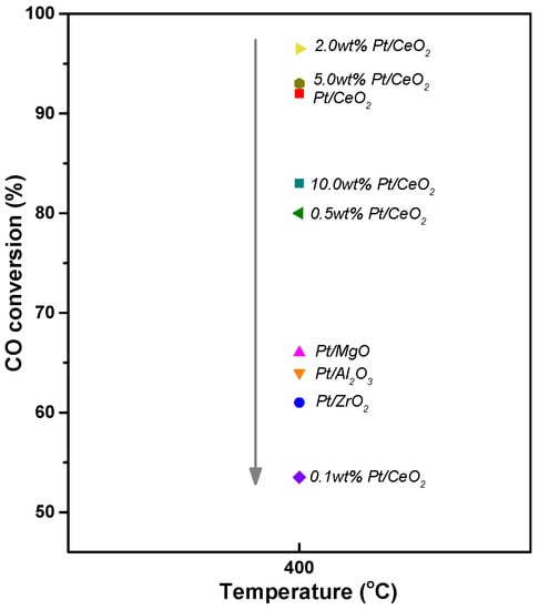 [Pt-S] Various supports were prepared by precipitation, and Pt/CeO2, Pt/MgO, Pt/Al2O3, and Pt/ZrO2 catalysts were produced using the IWI method. The loading amount of Pt on various supports was fixed at 2 wt% [59]. [Pt-L] A catalyst study in which Pt was added to CeO2 was conducted. Catalysts were produced using precipitation and the IWI method.