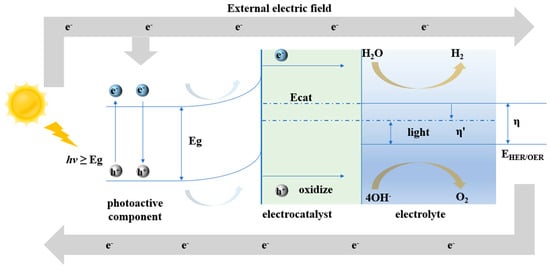 In recent years, multi-field coupling technology has been widely applied in the catalysis field. Introducing some external fields effects can optimize the catalytic process, and the reasonable utilization of resources can also be realized through the interconnection gain between energy fields [,]. Electrocatalytic and photocatalytic water splitting are essentially the same, both of which are redox reactions involving an electron transfer process []. Benefitting from this, the integration of light field and electric field has become possible and has been practiced in traditional photoelectrochemical (PEC) systems. In general, a PEC system is composed of a photoanode and a photocathode to independently drive the corresponding oxidation and reduction reactions, and an appropriate photoelectrode must have a matching band gap and energy band position [,]. In photoelectrocatalytic water splitting processes, light is the main driving force and the introduction of a small amount of electrical energy can help the reaction system to regulate the radiation recombination of some electron hole pairs and accelerate the separation of carriers excited by semiconductor photoelectrodes under sunlight [,]. Although the mechanism of photoelectrocatalytic water splitting has been relatively well-studied and a large number of photoelectric materials have been developed [,,,], the overall solar to hydrogen (STH) conversion efficiency is not still satisfactory. Inspired by electro-assisted photocatalysis strategies, photogenerated carrier-assisted electrocatalysis is considered as an innovative and feasible way to improve the overall catalytic performance. When introducing the light field, the electronic structure and surface reaction microenvironment of a specific electrocatalyst will be affected and thereby the internal catalytic pathway and performance will significantly change [,]. So far, the photothermal effect and the local surface plasmon resonance (LSPR) effect of noble metal nanoparticles and photogenerated carriers have been demonstrated to be effective strategies to assist in enhancing the activity of electrocatalytic HER or OER [,]. The photothermal effect generates a local high temperature to enhance the thermodynamic and kinetic processes of electrocatalytic reactions through the collision of photoexcited phonons, which is applicable to most electrocatalysts, but the stability of the catalyst structure at high temperature still needs to be considered [,]. Hot carriers excited by plasma radiation undergoing non-radiative decay in the LSPR effect have a higher energy than those directly excited by light and are hence the essence behind the enhancement in electrocatalytic activity, but the inevitable local heating of the surrounding environment caused by the internal relaxation of the high energy carrier makes distinguishing it from the photothermal effect challenging. In addition, high cost precious metals further limit the wide application of this strategy and transition metal/semiconducting metal oxide bifunctional catalysts are becoming more attractive [,]. In comparison, the photogenerated carrier-assisted strategy shows broader research prospects. Photogenerated carriers produced by photo-responsive electrocatalysts absorbing light energy can directly participate in the redox reaction and reduce the potential reaction barrier. The whole process is simple and efficient and can be realized by embedding the photoactive components [,]. However, there are few studies on photogenerated carrier-assisted electrocatalysis at present, and the specific enhancement steps are still unclear []. It is necessary to systematically summarize this field to promote the rational design and development of photogenerated carrier-assisted electrocatalysts.