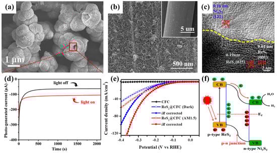 Single-component photoelectric integrated catalysts can naturally couple the electrocatalytic activity with the photoexcitation ability without introducing a photoactive component or an electrocatalytic promoter []. At the same time, they also have a strong photoelectric interaction and an efficient charge carrier transfer process, which are very attractive in the photoelectric coupling field []. Hao et al. prepared a photo-responsive Ni3(VO4)2 electrocatalyst with a sea-urchin-like shape (Figure 2a,d). Single component Ni3(VO4)2 showed an enhanced HER performance under light. The unique sea-urchin-like structure was conducive to the exposure of surface active sites and the effective extraction of photogenerated carriers []. Rhenium disulfide (ReS2) has a weak interlayer coupling and larger interlayer spacing caused by Peierls distortion, which gives it excellent photoelectric properties and exposes more edge active sites and proton permeation channels [,,]. Zeng et al. found that few-layer ReS2 with the advantages of both light collection and proton reduction kinetics can be used as a new single-component platform for photo-assisted electrocatalytic HER (Figure 2b,e). Due to the guidance of an external electric field and highly active sites, high-energy electrons can be effectively injected and the Fermi energy level of proton reduction can be improved, thus achieving excellent HER performance []. Inspired, Xu et al. constructed a ReS2/Ni3S2 p-n heterojunction on Ni foam in situ. Benefiting from the strong coupling cooperation between ReS2 and Ni3S2 heterointerfaces, effective separation of photogenerated carriers can be achieved, and the obtained electrode exhibited an obviously enhanced HER activity (Figure 2c,f) [].