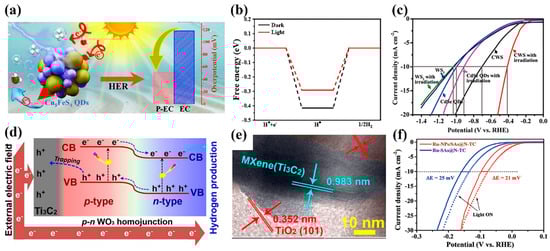 (a) Schematic diagram of the photo-assisted hydrogen evolution process for Cu5FeS4 QDs and (b) H* adsorption free energy of Cu5FeS4 QDs in dark and light conditions, respectively. Adapted with permission from ref. []. Copyright 2023, Royal Society of Chemistry. (c) LSV curves of CdSe QDs/WS2. Adapted with permission from ref. []. Copyright 2018, Royal Society of Chemistry. (d) Schematic diagram of the charge transfer process in a p-n WO3 homojunction under light irradiation. Adapted with permission from ref. []. Copyright 2019, Royal Society of Chemistry. (e) HRTEM image of P-TiO2@MXene. Adapted with permission from ref. []. Copyright 2021, Elsevier. (f) LSV curves of Ru-NPs/SAs@N-TC and Ru-SAs@N-TC. Adapted with permission from ref. []. Copyright 2020, Wiley—VCH.