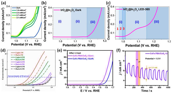 OER is a four-electron transfer process, and the slow reaction kinetics greatly limit the overall water cracking efficiency []. Therefore, it is necessary to develop highly active oxygen evolution catalysts to reduce the kinetic barrier of OER. At present, noble-metal-based materials such as Ir and Ru still represent the most advanced oxygen evolution catalysts. However, due to their high cost and scarcity, reducing the amount of precious metal loading while improving catalytic performance have become the main problems that must be solved []. Liu et al. prepared a IrOx@In2O3 composite material by the solvothermal method; the composite of In2O3 could reduce the loading of precious metal IrOx, and the heterojunction exhibited an enhanced OER performance. When a weak LED beam was introduced, the OER performance could be further improved. By amplifying the LSV curves, Liu et al. also discriminated the photocatalysis-dominated electro-assisted region and electrocatalysis-dominated photo-assisted region during the photogenerated carrier-assisted OER process, which provided effective insights for photogenerated carrier-assisted electrocatalysis strategies (Figure 4a–c) []. In addition to precious-metal-based materials, the development of efficient OER electrocatalysts based on non-noble metals is also very important. Transition metal sulfides (TMDs) are considered as promising catalysts for OER due to their unique electronic structure and excellent catalytic activity. The design of photogenerated carrier-assisted electrocatalysts based on TMDs for enhancing OER is equally promising. As a typical TMD, MoS2, with a unique layered structure and a high number of active sites exposed on the edge, has been widely studied as an OER electrocatalyst. Moreover, due to its appropriate band gap structure, MoS2 has also been widely applied as a photocatalyst []. Qi et al. introduced black phosphorus quantum dots (BP QDs) into MoS2 nanosheets by the liquid phase stripping method, and the constructed BP QDs/MoS2 heterojunction could realize a photo-enhanced OER performance []. The wide absorption band of BP QDs and the rapid electron transfer between 0D/2D heterojunctions results in more photogenerated holes being trapped. In addition, the large specific surface area of BP QDs was conducive to the reaction of photogenerated holes and electrolyte OH- ions (Figure 4d).