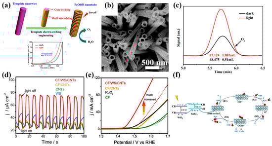 With the help of in situ characterization techniques, transition metal oxyhydroxides have been identified to be the most active for electrocatalytic OER []. Hu et al. synthesized a uniform FeOOH nanotube-loaded carbon cloth by the template electroetching strategy and used it as a photo-responsive electrocatalyst. Based on the high OER activity of FeOOH, charge carrier injection further reduced the OER overpotential (Figure 5a–c) []. In addition to designing photoelectric integrated catalysts, highly active electrocatalysts are also vital for the modification of photoactive species to enhance the efficiency of photogenerated carrier-assisted electrocatalysis. Lu et al. prepared a p-n heterojunction structured material: p-n WO3/SnSe2 []. The p-n heterojunction between WO3 and SnSe2, with a small bandgap, can improve the high carrier recombination in the original WO3 while enhancing its optical absorption ability. The p-n WO3/SnSe2 heterojunction was used to absorb light and generated high energy carriers. Coupling carbon nanotubes (CNTs) with CoFe LDH as the electroactive component leads to the construction of a successful photoelectric integrated catalyst. The coexistence of CNTs and CoFe LDH efficiently separates the photogenerated carriers, and thereby greatly enhances the photo-assisted electrocatalytic efficiency (Figure 5d–f).