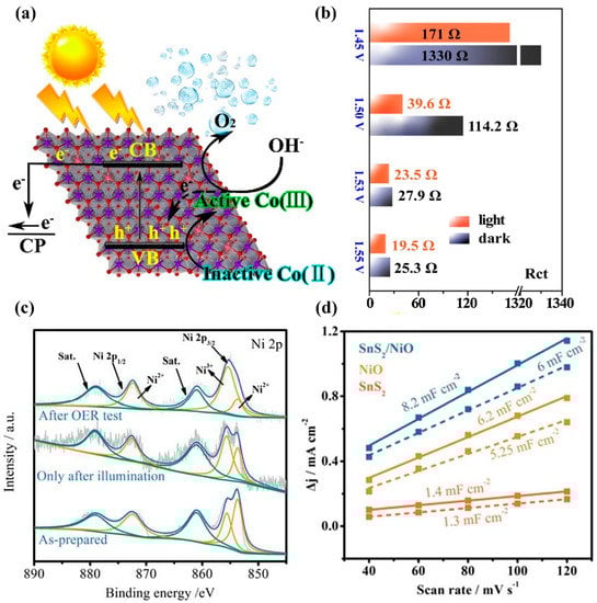 Owing to the surface charge accumulation, photogenerated holes can not only directly participate in oxidation reactions, but can also promote the formation of high-valence active species to indirectly enhance the OER performance. Fu et al. confirmed that photogenerated holes on the single-component CoCr-LDH could simultaneously stimulate the production of high-valence Co3+ active species and accelerate the charge transfer process, which are also the main reasons for the significant enhancement in electrochemical OER activity (Figure 6a,b) []. Similarly, Yang et al. showed that a p-n SnS2/NiO heterojunction could generate more high-valence Ni (Ni3+) on NiO as OER active sites after irradiation, which was further confirmed by XPS and electrochemical surface area (ECSA) tests after irradiation (Figure 6c,d) []. Such investigations provide new insights into the role of photogenerated holes in photogenerated carrier-assisted strategies. The main catalysts, experimental conditions, and activities of photogenerated carrier-assisted electrocatalysts for OER are listed in Table 2.