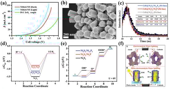 (a) Overall water splitting LSV curves of NiMoS in light and dark conditions. Adapted with permission from ref. []. Copyright 2020, Elsevier. (b) SEM image of CdS/Ni3S2. Adapted with permission from ref. []. Copyright 2021, Elsevier. (c) Time-resolved PL decay spectra of CdS@Ni3S2 and P-doped CdS@Ni3S2 and (d,e) Gibbs free energy of H* adsorption and oxygen-containing intermediate (OH*, O*, and OOH*) adsorption. Adapted with permission from ref. []. Copyright 2021, Wiley—VCH (f) Charge transport mechanism of CdS/NiCoS for electrocatalytic and photo-electrocatalytic overall water splitting. Adapted with permission from ref. []. Copyright 2020, Royal Society of Chemistry.