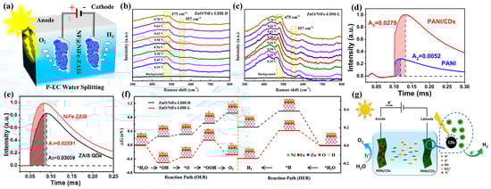 Two-dimensional transition-metal-based layered double hydroxides (LDHs) are a type of layered ionic material, and are composed of brucite-like positive charged layers formed by the coordination of trivalent metal cations with bivalent metal cations through hydroxyl substitution [,]. LDHs have a unique layered structure and abundant active sites and are often considered as excellent electrocatalysts []. Among various LDHs, NiFe LDH is regarded as one of the most effective bifunctional water splitting catalysts, and is easy to synthesize for the improvement in OER and HER activities []. In the past, the studies on NiFe LDH have mainly included morphology engineering, defect engineering, and the construction of layered/core–shell nanostructures []. An innovative strategy is to combine the photoactive components with highly active NiFe LDH in a photo-assisted electrocatalysis system to enhance its activity. Shi et al. embedded AgInZnS QDs into NiFe LDH nanoflakes by a hydrothermal treatment, and the prepared composite showed improved HER and OER properties under light irradiation. TPV tests indicated that the unique 0D/2D heterostructure could effectively extract the photogenerated charge of AgInZnS QDs to promote the charge transfer process (Figure 8a,e) []. Wang et al. prepared hydrangea-like ZnO/NiFe LDH composites with a large specific surface area by a two-step hydrothermal method. The introduction of light energy could greatly reduce the energy barrier required for the water splitting reaction. In situ Raman tests confirmed the improvement in the internal structure of the catalyst under illumination (Figure 8b,c). Combined with theoretical calculations, the electron transfer process and the intermediate adsorption were optimized, further revealing the origin of photo-enhanced activity (Figure 8f) []. In addition to noble metals and non-precious metals, the photogenerated carrier-assisted strategy can also be extended to metal-free dual-functional electrocatalysts. Kang et al. prepared a polyaniline (PANI)/carbon dot (CDs) composite as a metal-free bifunctional photogenerated carrier-assisted electrocatalyst []. PANI is a low cost, conductive polymer with a visible light response, a large π-conjugated electronic structure, fast redox characteristics, and excellent carrier mobility [,,]. CDs, as a kind of carbon nanomaterial, due to its environmental friendliness and excellent optical and physicochemical properties, exhibits obvious advantages in the field of catalysis [,]. TPV tests showed that the addition of CDs could improve the charge transfer rate and enhance the photoelectric effect of a PANI/CDs composite (Figure 8c,g). Finally, the main catalysts, experimental conditions, and activities of photogenerated carrier-assisted electrocatalysts for OER/HER (water splitting) are listed in Table 3.