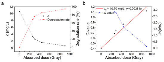 The G-value is an index of the utilization efficiency of active substances in the degradation of target pollutants. It can be defined as the number of particles that react (or are produced) when the irradiated medium absorbs 100 eV of irradiation energy [36]. The calculation method is shown in Equation (1), where the unit of the G-value is mol/J, c0 is the initial concentration, and c is the concentration after irradiation (mol/L). D is the absorbed dose in Gray, 6.02 × 1023 is the Avogadro number, and 6.24 × 1016 is the conversion factor from Gray to 100 eV/L.