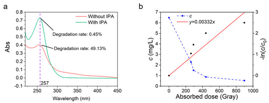 A free radical test was conducted to validate the conclusion. Isopropanol (IPA), an effective radical scavenger of ·OH, was added to the aqueous solution of sulfamethoxazole. Figure 3a shows the degradation results (initial SMZ = 9.72 mg/L, energy = 80 keV, beam current = 1 mA, and pH = 12). At an absorbed dose of 76 Gray, the SMZ solution added with IPA almost did not degrade (with a degradation rate of 0.45%), while the degradation rate of the control group without IPA was 49.13%. Such a discrepancy is solid evidence for confirming the dominant role of ·OH in the degradation of SMZ.