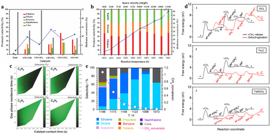- Bajec, D.; Kostyniuk, A.; Pohar, A.; Likozar, B. Nonoxidative methane activation, coupling, and conversion to ethane, ethylene, and hydrogen over Fe/HZSM-5, Mo/HZSM-5, and Fe–Mo/HZSM-5 catalysts in packed bed reactor. Int. J. Energy Res. 2019, 43, 6852–6868. [Google Scholar] [CrossRef]