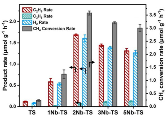 | Catalysts | Reaction Conditions | C2H6 Selectivity (% or μmol g−1 h−1) | CH4 Conversion (% or μmol g−1 h−1) | Reference | |