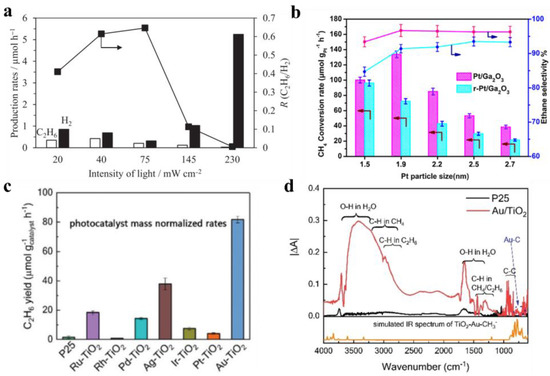 - Ma, J.; Tan, X.; Zhang, Q.; Wang, Y.; Zhang, J.; Wang, L. Exploring the Size Effect of Pt Nanoparticles on the Photocatalytic Nonoxidative Coupling of Methane. ACS Catal. 2021, 11, 3352–3360. [Google Scholar] [CrossRef]