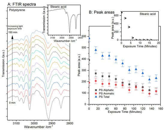 Decomposition of polystyrene was monitored in a similar way to the stearic acid. A 1 wt% solution of polystyrene (Sigma Aldrich, average Mw 35,000) in chloroform was prepared by weighing an individual pellet of polystyrene and dissolving in the appropriate amount of solvent, and then 200 µL of the solution was spin coated onto the photocatalyst at 2000 rpm. Analysis of these spectra required more complex fitting of the multiple absorptions present as there are both aliphatic and aromatic C–H stretches present, giving more information about the selectivity of the catalyst with respect to the two.
