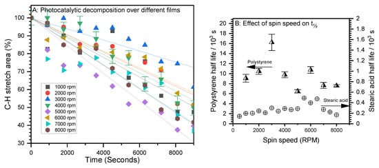 (A) Comparison of photocatalytic decomposition rates of polystyrene over Cu/TiO2 films prepared at different spin rates. Error bars have only been included for one data set for clarity, but a typical error calculated from repetition is ±4%. (B) Calculated t½ lives of polystyrene vs. spin speed compared with the t½ lives of stearic acid deposited on the equivalent films.