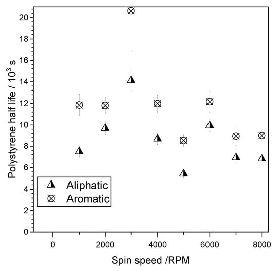 Whilst there is significant scatter in the results, every measurement shows a slightly longer ½ life for the aromatic over the aliphatic groups, but the difference is not as great as the difference in the overall rates of decomposition of the aliphatic only stearic acid and the mixed aliphatic/aromatic polystyrene.