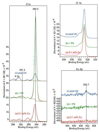 In the XP spectra, Figure 4 and Figure S5, the Cu 2p3/2 peak is only visible in the thicker films (slower deposition speeds) and where the concentration of copper is relatively high, but, in all cases, the Cu 2p peak appears at 932.7 eV, indicative of a Cu(I) or Cu(0) state [17], the former being the most likely although the usual satellite structure is too weak to give confirmation, and the LMM Auger peak is swamped by the Ti 2s peak. In the O(1s) region, the principal peak at 529.6 eV is due to TiO2 and the higher binding energy component at ~532 eV to the SiO2 substrate. A much smaller contribution at ~533 eV can be attributed to hydroxides or carbonates on the TiO2 surface. In the C(1s) region, the main peak is at 284.8 eV with a smaller component at 288.5 eV that can be attributed to carbonates. The doublet at 292.8 and 295.5 eV is due to the K 2p signal from the glass substrate onto which the TiO2 films are deposited. Deposition of the spin coated polystyrene, Figure 4, leads to the partial attenuation of all these peaks; the main carbon peak shifts to 284.5 eV, characteristic of a phenyl ring and accompanied by a weak shake-up satellite associated with delocalised systems at 291.2 eV [18]. Photocatalytic oxidation of the surface leads to the removal of the majority of carbon from the surface, with the main peak shifting back to 284.7 eV and the restoration of the intensity of all the other peaks.