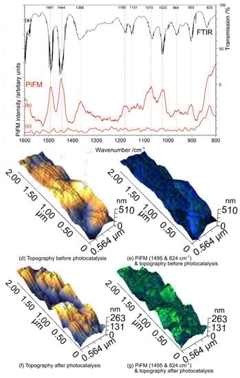PIFM and AFM data on polystyrene covered TiO2 films prepared at 5000 rpm. In the uppermost chart, the FTIR transmission spectrum from a polystyrene sample (a) is compared with the PiFM spectra obtained from the films before (b) and after photocatalysis (c). The topography of the polystyrene covered catalyst surface before and after photocatalysis is compared in (d,f). In (e,g), the local intensities of the signals at 1495 cm−1 (polystyrene, blue) and 824 cm−1 (TiO2, green) are mapped onto the topography.