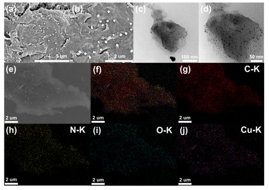 SEM images of CuxOy@CS-400 (a,b). TEM images of CuxOy@CS-400 (c,d). Elemental mapping of CuxOy@CS-400 (e−j).
