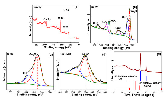 XPS spectra of CuxOy@CS-400: (a) Survey spectrum. (b) Cu 2p. (c) O 1s. (d) Cu LMM. (e) XRD spectra of CuxOy@CS-400.