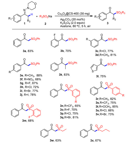 With the catalysts in hand, we chose the selective C–S coupling of acetophenone hydrazone 1a with sodium sulfinate 2a as the model reaction. In a preliminary test, the desired coupling product 3a was obtained in 56% yield with 30 mg of CuxOy@CS-400, 20 mol% of Ag2CO3, and 2.0 equivalents of K2S2O8 as the oxidant in acetone. Encouraged by this result, the CuxOy@CS-300 and CuxOy@CS-500 catalysts were applied for the sulfonylation reaction, respectively. The CuxOy@CS-400 was found to be the most efficient and afforded 3a in 56% yield, which indicates that the reaction efficiency followed the order: CuxOy@CS-400 > CuxOy@CS-300 > CuxOy@CS-500 (Table 1, entries 1–3). Subsequently, other Cu catalysts, such as Cu powder, Cu2O, and heterogeneous catalysts prepared by our group (Table S1) were also investigated, and the results showed the poor formation of the target product (Table 1, entries 4–6). It was demonstrated that the active substance Cu2O has a direct effect on the activity of the catalyst. Due to the pyrolysis product of copper(II) acetate being greatly affected by operating conditions, the CuxOy@CS-400 catalyst contains a more active substance Cu2O than other pyrolysis catalysts [63]. The sulfonylation reaction didn’t proceed in the absence of a Cu catalyst (Table 1, entry 7). To increase the formation of product 3a, reaction conditions, including types of oxidants, solvents, and temperatures, were screened. To our surprise, the yield of the desired product 3a could be significantly enhanced to 81% when the sulfonylation reaction was performed using K2S2O8 as the oxidant (Table 1, entry 8), and the yield was only 41% when (NH4)2S2O8 was replaced with K2S2O8 (Table 1, entry 9). Subsequently, several solvents were tested; when using MeCN, H2O, and toluene as the solvents, the yields of product 3a were 23, 0, and 35%, respectively (Table 1, entries 10–12). Changing the loading of the catalyst or reaction temperature could not increase the reaction efficiency (Table 1, entry 13–15). Therefore, the optimized results for the copper-catalyzed direct C–S coupling reaction were achieved with acetophenone hydrazone 1a, sodium benzenesulfinate 2a, CuxOy@CS-400, silver carbonate, potassium persulfate was carried out in acetone at 80 °C under air for 5 h.