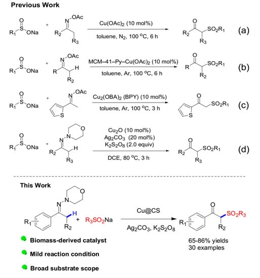Organosulfur compounds play an essential role in organic chemistry, as well as in medicinal chemistry [1,2,3,4,5]. Hence, particular interest has been focused on the synthesis of organosulfur compounds due to their potential to serve as novel pharmaceutical, agricultural, and chemical agents [6]. Among the organosulfur compounds, β-ketosulfones have acquired increased relevance in organic and medicinal chemistry in the past few years [7,8,9,10]. This is not only due to their important application in organic synthesis but also to their exhibiting a spectrum of biological activity (Figure 1) [11,12,13,14,15]. Recently, sulfonylation has drawn significant intense attention as one of the promising synthetic methods for the preparation of β-ketosulfones and their analogs [16,17,18,19]. The general approach to the synthesis of β-ketosulfones is the nucleophilic substitution reaction of sodium sulfonates with α-haloketone [20,21,22]. One representative method for the preparation of β-ketosulfones involves Cu-catalyzed direct C–S cross-coupling of various oxime acetates with sodium sulfinates to construct a C(sp3)–S bond reaction [23,24,25,26,27,28,29,30,31,32,33,34,35,36]. Alternatively, various β-ketosulfones can be prepared through the Cu-catalyzed direct C–S coupling reaction of substituted alkenes with various sulfonylhydrazides under an oxygen atmosphere. Recently, Jiang’s group reported an interesting two-step synthetic method that involved the oxidative coupling of sodium sulfinates and oxime acetates using copper (Scheme 1a) [37]. Drawing inspiration from this work, Xia et al. employed oxidative coupling of oxime acetates with sodium sulfinates under heterogeneous catalysis (MCM-41-Py-Cu(OAc)2) (Scheme 1b) [38]. Similarly, Phan’s group developed a metal-organic framework (MOF)-based Cu2(OBA)2(BPY) catalyst that was used as a recyclable heterogeneous catalyst for oxosulfonylation (Scheme 1c) [39]. In 2021, Liu’s group further synthesized β-ketosulfones from hydrazones and sodium sulfinates by synergistic copper/silver catalysis (Scheme 1d) [40]. However, despite notable advancements obtained in this area [41,42,43,44], the development of a recyclable and facile protocol for the construction of biologically active β-ketosulfones remains highly desirable.