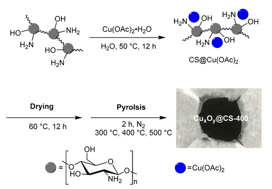 The precursors of our novel catalysts were prepared by the impregnation method. Firstly, the commercial chitosan was added to an aqueous solution of Cu(OAc)2 to obtain a suspension that was stirred for 3 h at 50 °C. After cooling the reaction mixture to room temperature, the copper@CS solid was obtained through the separation of the water by reducing the pressure and dried under vacuum at 60 °C overnight. Then, the dried samples were transferred into a porcelain boat and placed in an oven. The oven was flushed with nitrogen, followed by pyrolysis at 300, 400, and 500 °C. The obtained chitosan-based catalysts were named CuxOy@CS-T, where T denotes the pyrolysis temperature (Scheme 2). Finally, the as-prepared catalysts were stored in screw-capped vials without any special protection from the air at room temperature. The most active catalyst obtained by pyrolysis at 400 °C was fully characterized by various methods. Fourier transform infrared (FTIR) spectroscopy is a significant strategy to research catalyst structure. The FTIR spectrum of the CuxOy@CS-T catalyst exhibits characteristic bands that were similar to the chitosan structure (Figure S1). The peak at about 3449 cm−1 corresponded to the associated -OH groups and N–H stretching [54]. The weak peak that appears at approximately 2973 cm−1 was assigned to C–H stretching [55]. The band at 1658 cm−1 was attributed to the amide vibration of the remaining acetyl groups of chitosan [54,55]. The characteristic band at 1031 cm−1 was attributed to C–O stretching vibrations [55]. Typical characteristic peaks such as –OH and –NH2 were found in the characterization of the carbon materials by FTIR, which demonstrated that the carbon materials have excellent adsorption capability for metals. Thermogravimetry (TG) obtained during the heat treatment of the Cu(OAc)2-Chitosan complex under a nitrogen atmosphere is shown in Figure S2. There was a rapid mass loss in the temperature range from 250 °C to 400 °C, which could be ascribed to the degradation of chitosan polymer and acetate counteranion. The catalyst material yield for the pyrolysis at 400 °C was 54.8 wt%. Scanning electron and transmission electron micrographs obtained from the prepared CuxOy@CS-400 catalyst are shown in Figure 2. The results indicate that the Cu was evenly distributed throughout the catalyst, and no agglomerated particles could be observed. It was also evidenced that the copper nanoparticles were successfully immobilized with the pyrolyzed chitosan (Figure 2a–d). The element mapping performed with the prepared CuxOy@CS-400 catalyst showed the homogeneous presence of carbon, nitrogen, and oxygen together with copper elements(Figure 2e–j).