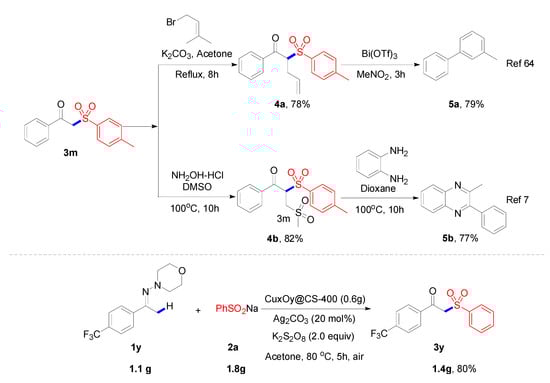 To demonstrate the potential applications of this strategy, the derivatization and the gram-scale preparation of β-ketosulfones were examined (Scheme 3). The desired products 5a and 5b could be easily obtained with good yields. Furthermore, the bioactive molecule 3y was synthesized on a gram scale with an 80% yield. These results clearly show the practicality of the strategy in organic synthesis.