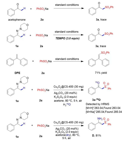 Both stability and reusability are important parameters for transition-metal-catalyzed reactions. Further experiments were performed to verify the catalyst recyclability using the reaction of acetophenone hydrazone 1a with sodium benzenesulfinate 2a as a model system. As depicted in Figure 5, after five successive cycles, affording the desired product 3a in 78% yield. The catalytic performance is only slightly affected. In addition, a hot filtration experiment was performed to determine whether the transformation was derived from the catalyst or a leached copper species. The sulfonylation reaction between acetophenone hydrazone 1a and sodium benzenesulfinate 2a under the optimized conditions was conducted. After 2 h, the CuxOy@CS-400 catalyst was hot-filtered and the catalyst-free solution was performed continuously at 80 °C under air for 12 h. However, the yield of the desired product 3a did not increase. No measurable leaching of copper from the catalyst by ICP-AES analysis after the first and fifth runs was observed.