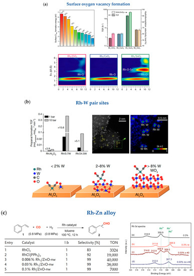 Regarding oxide supports, three synthetic strategies are developed to design stable and reactive Rh SACs, including creating oxygen vacancies on the supports (Figure 2a), fabricating dual-metal sites (Figure 2b), and forming metal alloy species (Figure 2c). A systematic study on some representative oxide-supported Rh SACs was performed, correlating the densities of oxygen vacancies with catalytic performances (Figure 2a) [17]. It is obvious that the existence of oxygen vacancies on the oxide surface leads to the dominant hydroformylation pathway rather than the hydrogenation reaction. Moreover, the oxygen-defective SnO2-supported Rh SAC showed hundreds of times higher reactivity than that on ZrO2 support in the gas-phase hydroformylation of ethylene. These results revealed that the delicate design of the surface defects, such as vacancies and step sites, are helpful for achieving excellent catalytic activity on the reducible-oxide-supported Rh SACs. As shown in Scheme 2, the Heck–Breslow mechanism is proposed for the Rh catalysts on the oxygen-defective support. After CO and H adsorption, insertion of ethylene into the Rh-H bond provided an ethyl group. Following this, an additional CO molecule inserted into the Rh-ethyl bond, and the subsequent reductive elimination formed the final product. However, oxygen vacancies are rarely found on inert oxides such as Al2O3 and SiO2, so dual metal sites are concisely fabricated to increase reactivity. In the case of Al2O3-supported Rh-WOx catalysts (Figure 2b), increasing the loading of WOx could lead to different structures of catalytic sites, and the atomically dispersed Rh-W pair sites achieved the highest rate of ethylene hydroformylation to propanal [18]. Unlike traditional Rh SACs, the synergetic effects of Rh and W species was suggested by unique mechanism calculations involving Rh-assisted WOx reduction, ethylene transfer from WOx to Rh atoms, and H2 dissociation at the Rh-WOx interface (Scheme 3). In the above two cases, the Rh centers are both in the positive valence state, while the electron-rich Rh single atoms are seldom reported. We fabricated ZnO-nanowire-supported Rh SACs and used the in situ EXANES and XPS techniques to verify that after mild H2 reduction at 200 °C, the isolated Rh species were at the approximately Rh0 state (Figure 2c) [19]. A plausible explanation for this is that Zn2+ was simultaneously reduced to Zn0, transforming electrons to lower the oxidation state of the nearby Rh species. The Rh/ZnO SACs were even slightly more reactive and chemo-selective than the homogeneous Wilkinson’s catalyst in styrene hydroformylation (Figure 2c), demonstrating that regulating the valence state of Rh sites is pivotal for achieving excellent catalytic performance.
