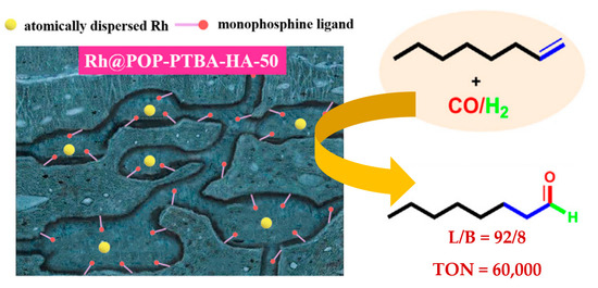 Although very high reactivity is fulfilled by the oxide-supported Rh SACs, regio-selectivity in hydroformylation is another concern. For the SACs on the open oxide supports, a similar number of linear and branched aldehyde products always generate at the same time [19]. Therefore, the spatial confinement strategy is thus developed to precisely control the regioselectivity. In this context, the zeolite matrix [20] and the porous polymer [21] are identified as suitable supports to locate single Rh atoms. The Rh@Y zeolite catalyst was prepared with the in situ hydrothermal method, achieving 100% chemo-selectivity and good regioselectivity toward heptanal (linear/branched = 2.2) in the hydroformylation reaction of 1-hexene [20]. Inspired by the homogeneous catalytic systems, wherein high regio-selectivity can be obtained by adding excess amount of phosphine ligands, Rh@POP-PTBA-HA-50 was designed to encapsulate atomically dispersed Rh species within porous monophosphine polymers (Figure 3), and the selectivity of linear aldehyde was remarkably increased to 92% in 1-octene hydroformylation [21]. Detailed mechanism studies revealed that abundant phosphine ligands within polymer substrates endow the isolated Rh sites with high activity and stability. The similar coordinating effect of N to the single metal centers might also promote regioselectivity. For example, a Ru@NC SAC exhibited very good activity (TOF = 12,000 h−1) and remarkable regioselectivity (linear/branched = 93:7) in the hydroformylation of 1-hexene, owing to the presence of Ru(II)-Nx-active species on the N-doped carbon support [22].