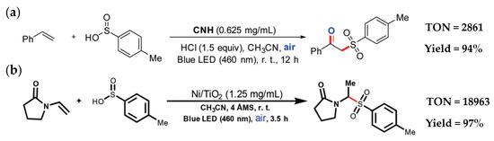 Carbon nitride (CN) and TiO2 are frequently used in photocatalysis as support materials for the capability to separate photogenerated electron pairs and holes. Recently, single-atom photocatalysts have been attracting increasing attention because of their improved photocatalytic performance. As shown in Figure 6a, Wen and co-workers reported a biomimetic single Fe-atom photocatalyst CNH through coupling CN with hemin [27]. Under visible light irradiation, up to 94% yield of β-ketosulfone was obtained with the CNH-catalyzed sulfonation reaction. Later, the same group prepared another SAC, Ni/TiO2, which can be easily scaled up for photocatalytic site-selective sulfonation, transforming enamide to α-amidosulfones and β-propionamidosulfones with TON levels as high as 18,963 under visible light (Figure 6b) [28].