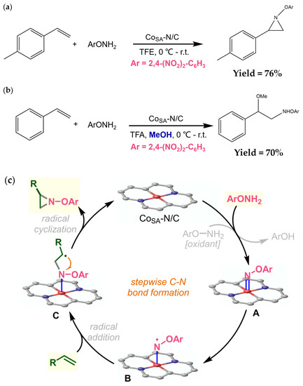 Recently, an unprecedented C-N bond formation of alkenes was revealed by a Co SAC, namely CoSA-N/C, which was derived from a bimetal-organic framework. CoSA-N/C showed good aziridination activity, transforming alkene to aziridine at 0 °C (Figure 7a) and further achieved direct oxyamination (Figure 7b) by adding methanol into the reaction system. The substrate scope can expand to a series of styrene derivatives and dienes, and some drug-derived olefins could also smoothly undergo the aziridination process [29]. Based on previous reports and experimental results, the authors proposed a stepwise mechanism shown in Figure 7c.