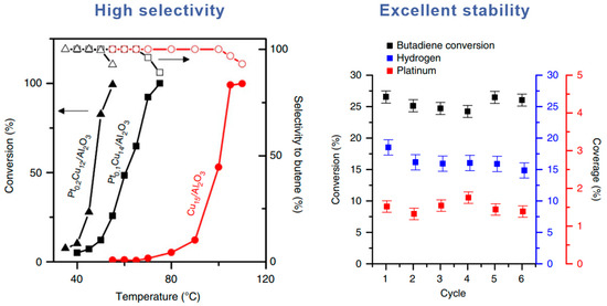 The oxide-supported single-atom alloy (SAA) is also capable of performing conversions with good selectivity. Lucci et al. fabricated the γ-alumina-supported Pt-Cu SAA with isolated Pt atoms located in the Cu(111) surface. The as-prepared Pt/Cu(111) SAA could display high selectivity and excellent stability under working conditions (Figure 9) [41]. DFT calculations revealed that H2 was readily activated on the single Pt atoms, and the dissociated H species could migrate to the Cu sites through the spillover effect. The selective hydrogenation to butene was attributed to the weak binding of the butadiene substrate on the Cu site.