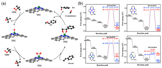 The electronic structures of single-metal atoms supported on a phosphotungstic acid (PTA) cluster were systematically investigated with DFT calculations to predict the catalytic performance in ethylene epoxidation. Among the non-noble transition metals (Fe, Co, Ni, etc.), Fe preferred to anchor at the four hollow (4H) site of the PTA cluster [42]. Moreover, the strong covalent metal-support interaction between Fe and PTA is the foundation for high stability. Similarly, according to the literature [43,44,45], a mechanism for selective oxidation of styrene is proposed in Figure 10a. DFT calculations predicted that the activity of Co-N3 SAC in styrene epoxidation could be further improved by constructing unsaturated defect sites, which underwent lower free energy compared to the Fe-N4, Cu-N4 and Co-N4 structures (Figure 10b) [46]. Using tert-butyl hydroperoxide (TBHP) as the oxidant, 99.9% of the styrene conversion was achieved with 71% selectivity to styrene oxide.
