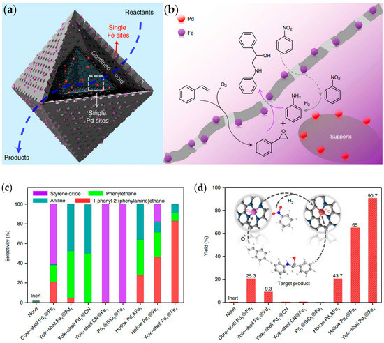 Furthermore, two active metal sites can be combined as tandem catalysts. Sarma et al. reported an olefin isomerization-hydrosilylation reaction by adding two SACs, Ru1/CeO2 and Rh1/CeO2, in one pot, achieving 95% regioselectivity to the terminal organosilane [55]. In 2021, a biomimetic SAC (Pd1@Fe1) was fabricated, integrating two kinds of single-metal atoms in the MOF-derived yolk and N-doped carbon shell structure, respectively (Figure 12a) [56]. The single Fe and Pd sites could respectively catalyze nitrobenzene hydrogenation and styrene epoxidation, leading to a cascade synthesis of amino alcohols (Figure 12b). The detailed reaction mechanism was investigated by the control experiments (Figure 12c) and DFT calculations (Figure 12d), providing a versatile strategy to integrate different kinds of SACs within one reaction system.
