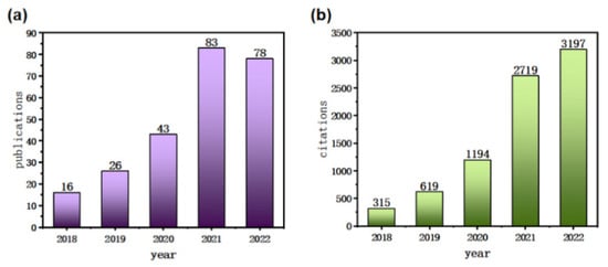 Number of (a) publications and (b) citations obtained from a survey performed in the Web of Science using “MIL” AND “Fenton” as keywords (data from 2018 to 2022).
