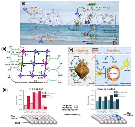 (a) Schematic for the reaction mechanism in MIL-101(FeII3, Mn)/H2O2/phenol system []; (b) Schematic illustration of SMX removal in the Fe0.75Cu0.25(BDC)/H2O2 system []; (c) Reaction mechanism of contaminant degradation in FeNi1/60-BDC/H2O2/visible light system []; and (d) Schematic illustration of CuMnMIL and comparison before and after degradation [].