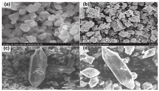 The SEM images of (a) MIL-101(Cr) [], (b) nZVI/MIL-101(Cr) [], (c) MIL-88B-Fe, and (d) CUCs-MIL-88B-Fe [].