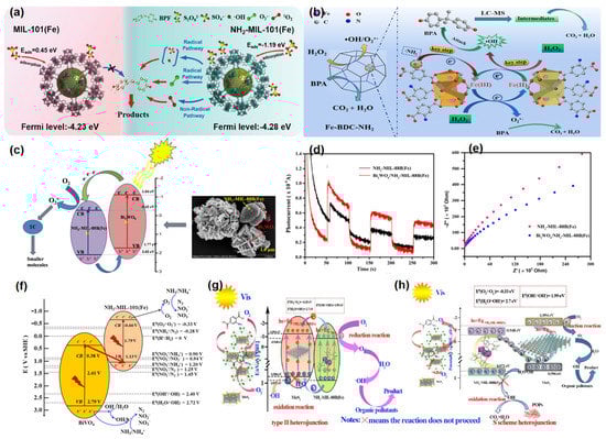 (a) Schematic illustration of mechanism of BPF removal in NH2-MIL-101(Fe)/PS or MIL-101(Fe)/PS systems []; (b) Schematic illustration of mechanism of BPA removal in Fe-BDC-NH2/H2O2 system []; (c) Proposed photocatalytic mechanism of Bi2WO6/NH2-MIL-88B(Fe) composite for the degradation of TC []; (d) Transient photocurrent response []; (e) EIS spectra of NH2-MIL-88B(Fe) and Bi2WO6/NH2-MIL-88B(Fe) []; (f) Mechanism for ammonia removal []; (g) type II photocatalytic mechanism for NH2-MIL-88B(Fe)/MoS2 nanocomposite under Xenon lamp irradiation []; and (h) S-scheme photocatalytic mechanism for NH2-MIL-88B(Fe)/MoS2 nanocomposite under Xenon lamp irradiation [].